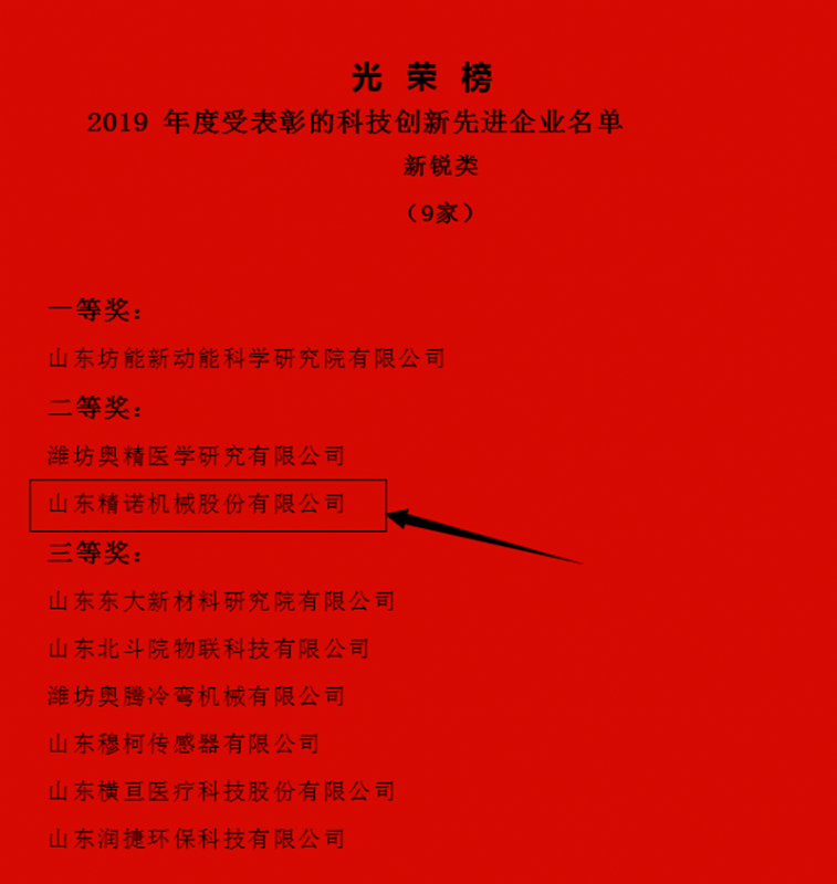 山東精諾機械股份有限公司獲得本年度科技創新先進企業新銳獎